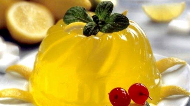 ٣. يسكب عصير البرتقال الطازج في مقلاة ويضاف 1/4 كوب من السكر. يحرك بواسطة خلاط يدوي بينما يسخن المزيج وليذوب السكر. ترش ملعقة صغيرة من مسحوق الجيلاتين على الوجه ويحرك المزيج باستمرار على نار متوسطة حتى يغلي. يغلى لمدة دقيقتين ويزال عن النار. يسكب برفق في القالب مع الحرص على عدم تحريك شرائح الليمون والجريب فروت.