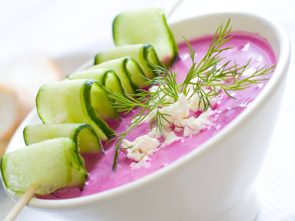 يقدم الحساء و يجمل بالكريمة الحامضة و الخيار .