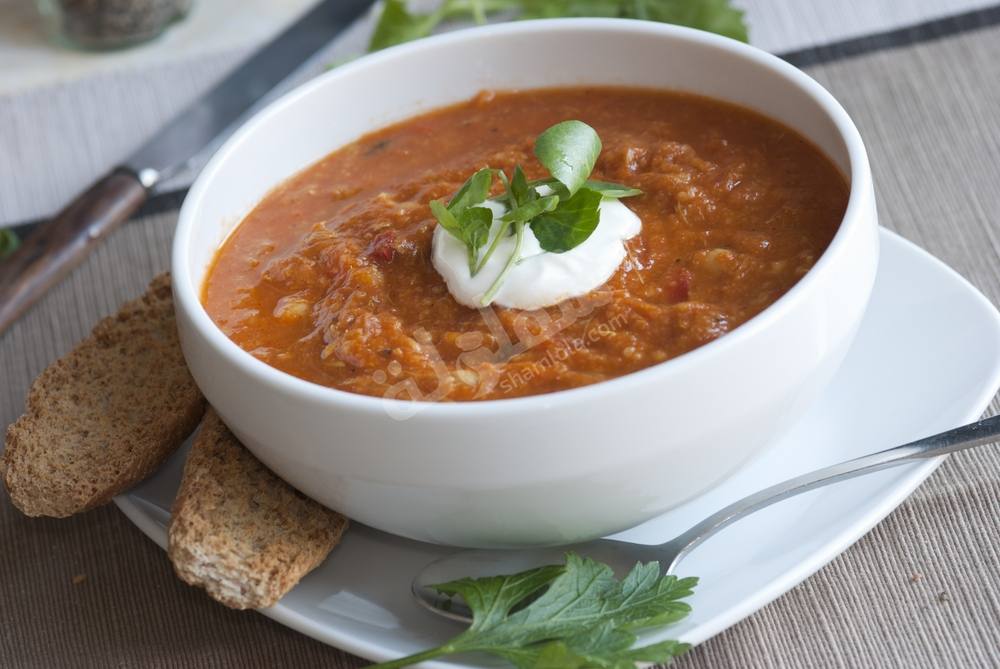 - يهرس الحساء بواسطة محضر الطعام حتى يصبح خليط املس ثم تصفى بمصفى مع الضغط عليها بظهر ملعقة .