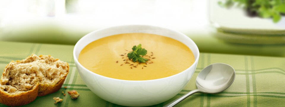 يصب الحساء في أطباق التقديم وينثر عليه كريمة جوز الهند والكمون ويقدم مع الخبز .