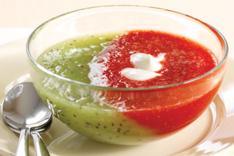 - يوضع الكيوي ونصف كل من الماء والسكر والفانيليا في الخلاط و يمزج حتى يصبح سلس ثم يصب في 4 أطباق صغيرة و يشطف إبريق الخلاط ثم تضاف الفراولة و باقي الماء والسكر والفانيليا و يمزج حتى يصبح سلس ثم يصب برفق في جانب واحد من كل طبق .
