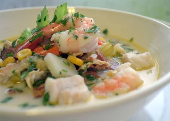 - تسكب الكريمة و البازلاء أو الذرة، و بلح البحر و الروبيان و يحرك الحساء ليكتسب بلح البحر و الروبيان بعض الحرارة فقط حيث يجب الإنتباه ألا يطهى زيادة عن اللزوم (تخفف درجة الحرارة في هذه المرحلة) .