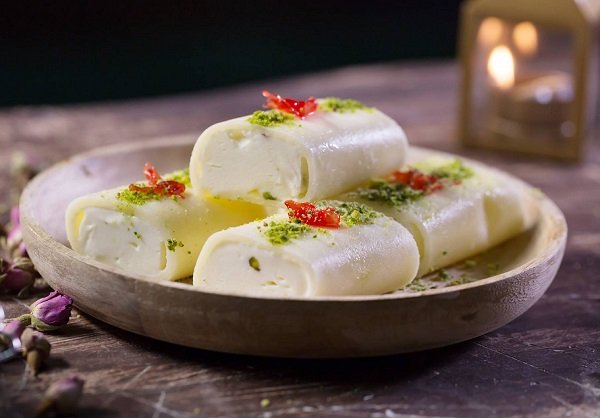 - نقطع كل رول إلى قطع ونزينها بالفستق المبشور ويقدم إلى جانبها القطر حسب الرغبة وهكذا تصبح حلاوة الجبن جاهزة للتقديم .