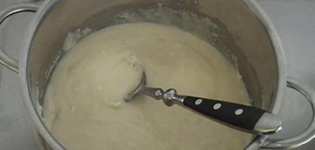 - بنفس الطريقة السابقة ضعي السمن أو الزيت النباتيّ في قدر على النار، ثمّ أضيفي الدقيق والحليب والنشا، وحرّكي حتّى يصبح لونهم غامقاً بعدها أضيفي القطر بالتدريج مع التحريك بشكل سريع حتى لا يتكتّل الدقيق والنشا.