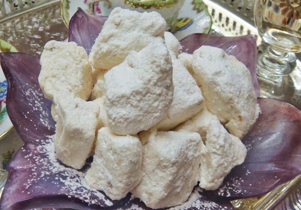 5. نبدأ بتشكيلها وهي دافئة كي لا تقسى نأخذ قطع نحشيها رشة هيل وجوز ونكورها ونغطيها بالطحين هكذا الى أن تنتهي كل الكمية نحفظها لليوم التالي بالطحين ونضعها في طبق التقديم وبذلك تكون جاهزة .