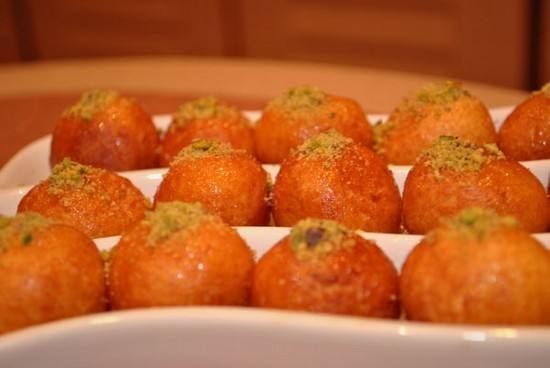 - درجة حرارة الزيت متوسطه لانها تحمر بسرعة نسقط الكرات ببطء ونحركها ونقلبها حتى تاخذ لون واحد ثم نسقطها بشربات ثقيلة ونضعها فى طبق التقديم ونرشها بمكسرات .