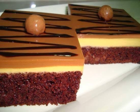 - نوزع الخليط على الطبقة السابقة برفق و بواسطة مصفاه حتى نمنع الرغوه من نزولها بالصينيه .