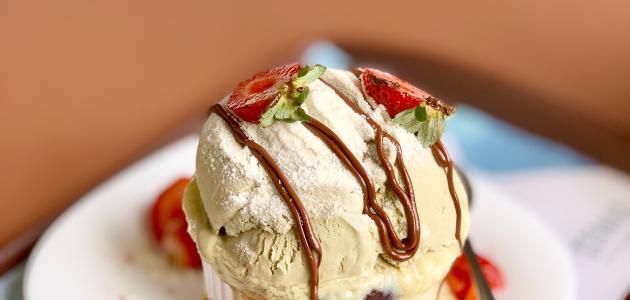 - تقديم الآيس كريم مع صلصة الشوكولاتة وتزيينه بالجوز المفروم.