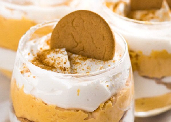 3. نضع في زبادي البارفيه أول طبقة وهي البسكويت الذي قمنا بسحقه ثم طبقة من مزيج القرع ثم القليل من الكريمة . نكرر العملية لعمل طبقات مماثلة من البسكويت ومزيج القرع والكريمة ونزين أخيراً بقطعة بسكويت .