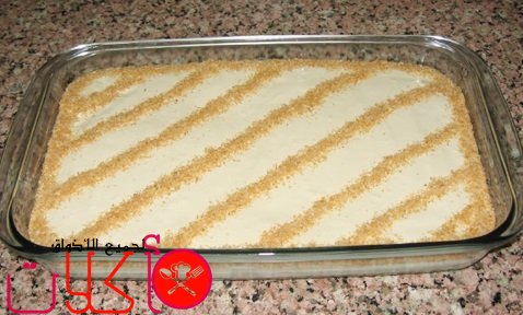 7- نصب الخليط فوق عجينة السميد ونجعلها مستوية