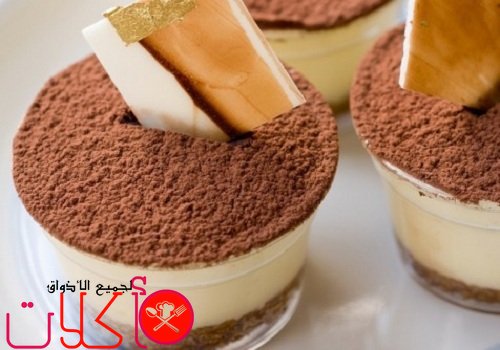 ننخل الكاكاو فوق الخليط ونضعه في البراد وعند اتقديم نزينه بصوص الشوكولاته