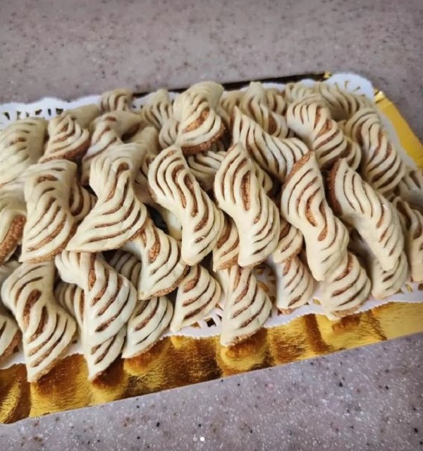 - نلف العجينة عليها ونبرمها ثم بالسكين نشكل على وجهها خطوط مائلة ثم نقطعها لقطع صغيرة بهذا الشكل .