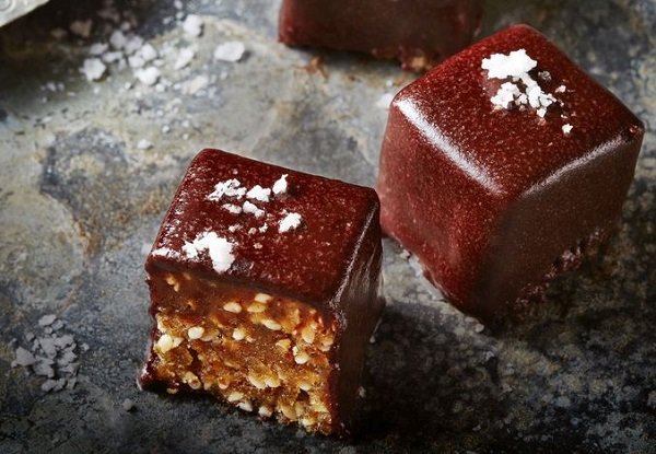 حلى بالتمر المعجون ، مربعات مغذية من خليط التمر المفروم مع الطحينة وبذور السمسم مغمسة بخليط من الكاكاو، زيت جوز الهند والعسل، لا تحتاج لفرن ويعتمد تحضيرها علي، التجميد في الثلاجة.