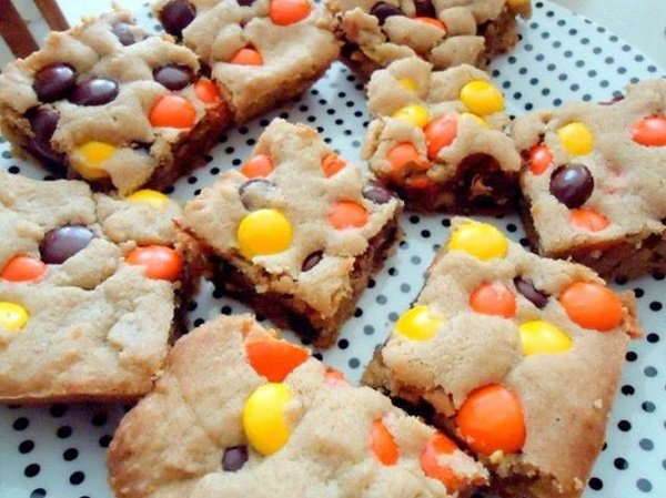 حلى بلونديز كيك ذهبي طيب مع زبدة الفستق وحبيبات الشوكولاتة الملونة. مربعات شهية مع فنجان من القهوة، قدمي حلى بلونديز للضيوف ولأفراد عائلتك بعد الغداء.