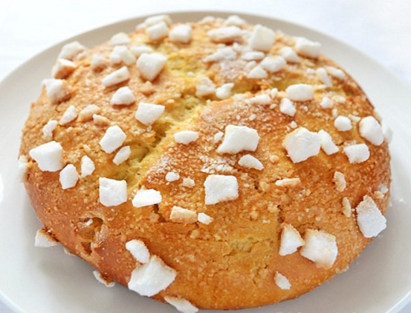 - نخفق البيضة المتبقية، وندهن بها سطح العجين، ونرشها بمكعبات السكر، وننقلها للفرن المحمى 175 درجة مئوية لمدة 45 دقيقة حتى تصبح ذهبية، ونقدمها عندما تبرد