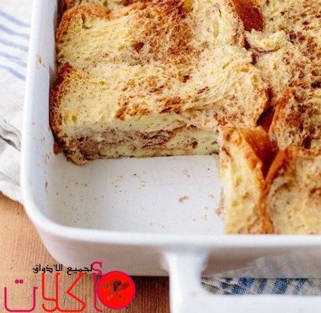 خبز بالكاسترد طبق مناسب لوجبة الإفطار، حلو وغني، مت طبقات من خبز الصمون المشرح وفوقه كاسترد من البيض، الحليب، القرفة، جوزة الطيب مع حشوة من كريمة الجبنة المنكهة أيضاً بالقرفة.