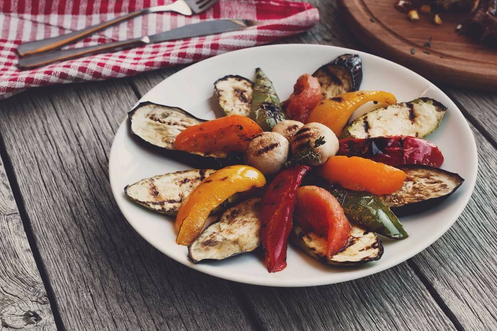- ترص الخضروات المشوية في طبق، ويصب فوقها خليط الثوم والخل.