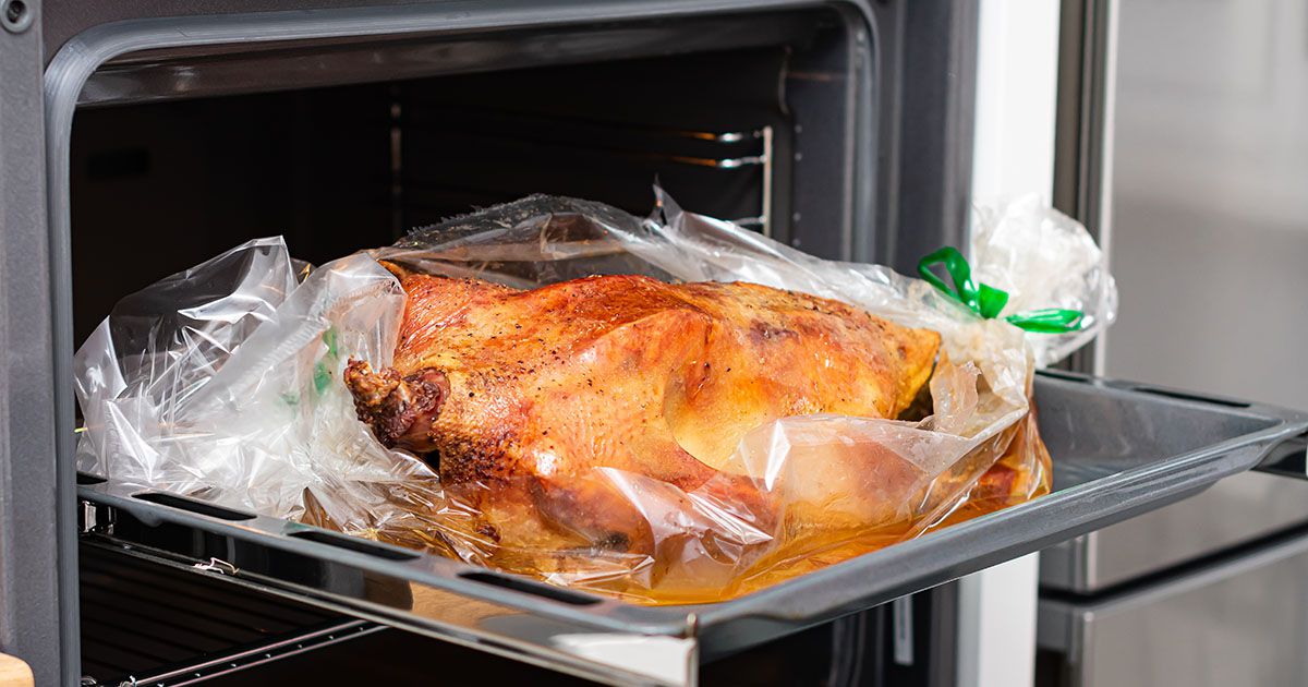 4- أخرجي الصينية من الفرن وأزيلي كيس الفرن بعناية. ضعي الدجاجة على صينية الفرن وأدخليها مجدداً إلى الفرن حتى تتحمّر.