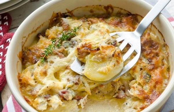 - نضع الدجاج والبطاطس بالكريمة في طبق التقديم ونقدمه ساخناً .