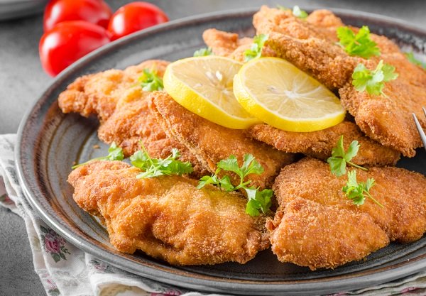 - نحضر ثلاثة أطباق الأول يحتوي على الطحين مع رشة ملح وفلفل أسود والثاني على البيض مع القليل من الحليب والثالث على الكعك المطحون بعد خلطه مع الكورن الفليكس .