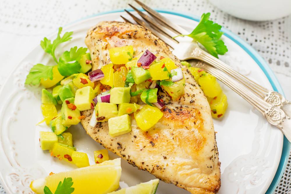 يقدم الدجاج مع صلصة الأناناس وشرائح الليمون .