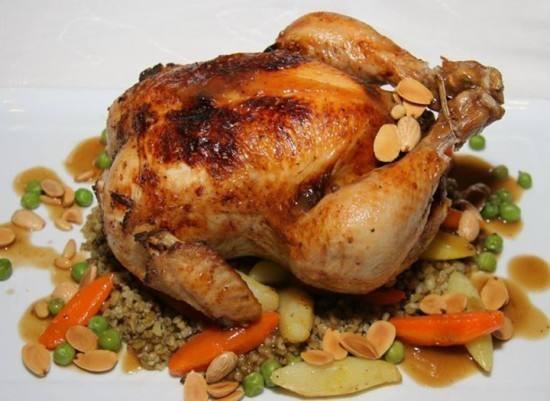 - سخني الزيت فى مقلاة كبيرة على نار متوسطة، وتحمر به صدور الدجاج على كلا الوجهين، ثم ترفع من المقلاة وتترك فى طبق جانبى.