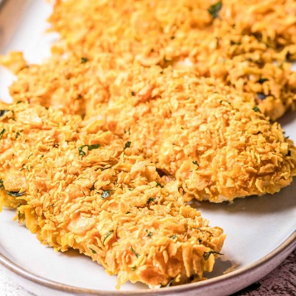 دجاج كرانشي وصفة لذيذة ومقرمشة مناسبة للأطفال وهي عبارة عن فتايل دجاج متبلة بالبهارات والحليب ومغمسة بالكورن فليكس ومقلية بالزيت .