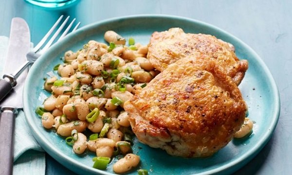 دجاج محمر بدون فرن مع الفاصوليا ، أفخاذ دجاج محمرة بالزيت مع الأوريجانو ويقدم مع مرقة من الفاصوليا البيضاء، البصل الأخضر، البقدونس، جوزة الطيب.