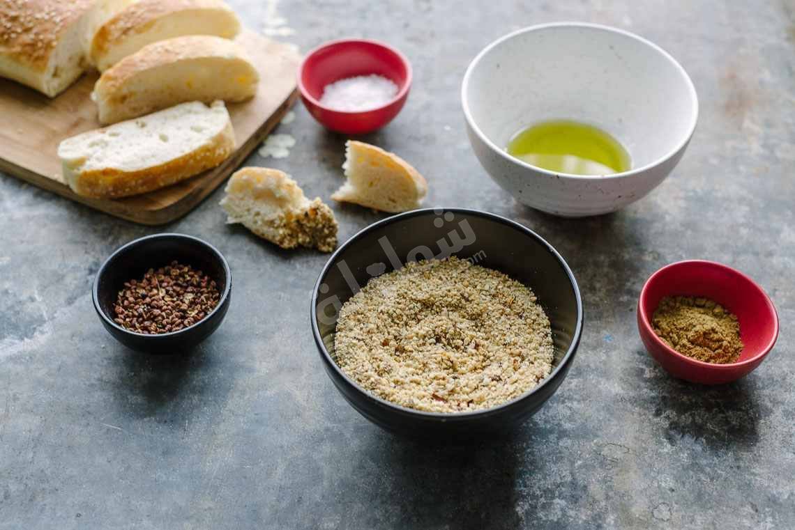 - يوضع اللوز الملح والكمون والكزبرة في محضر الطعام و يطحن حتى يصبح ناعم ثم ينقل لطبق و تضاف بذور السمسم و رقائق الفلفل .