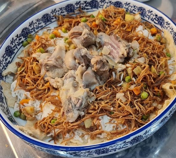 5. في وعاء التقديم نضع طبقة خبز عراقي ونسقيه بمرق اللحم ثم نضع الأرز الأبيض فوقه ثم طبقة الشعيرية وعلى الوجه نوزع قطع اللحم ونزين المنسف بالمكسرات والزبيب حسب الذوق .