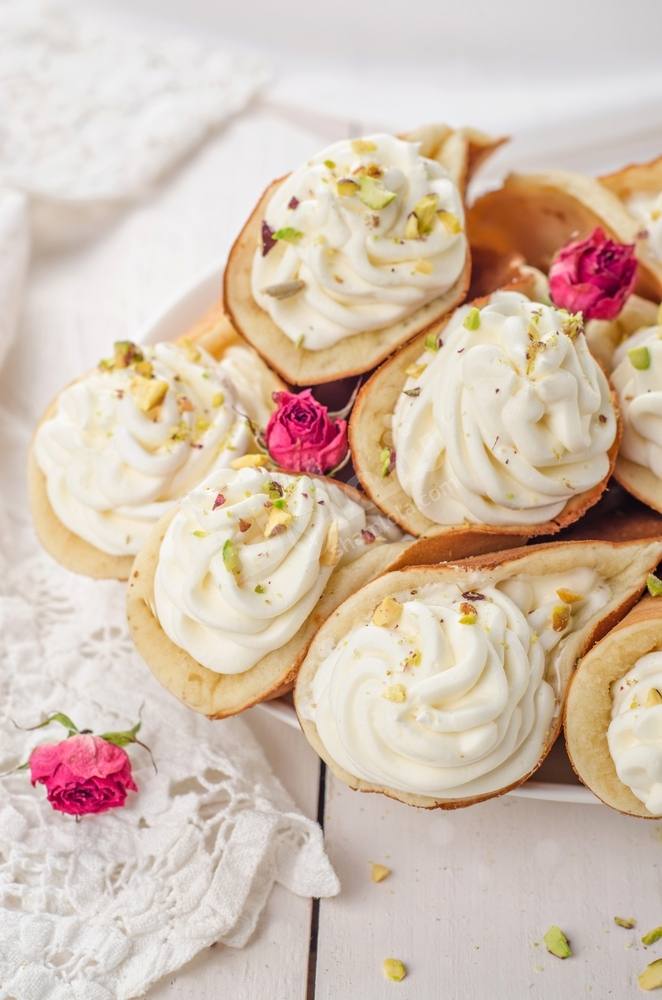 يُحشى الملبن أو راحة الحلقوم بالقشطة، ويزين بالفستق والزهور .
