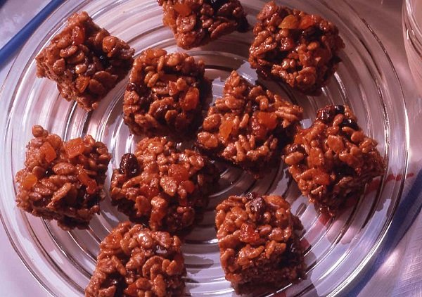 رايس كرسبي بالشوكولاته ، كيك لذيذ، خفيف وشهي بدون طحين، وبدون فرن، يتكون من حبوب الأرز الهشة مع الزبيب، المشمش المجفف، المارشميللو، الحليب، والشوكولاتة.