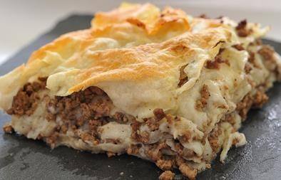 3. وفي صينية كبيرة مدهونة بزبدة ونسقي الرقاق بالشوربة ثم نضع طبقتين في صينية ونضغط عليها ثم نضع طبقة من الخضروات ونضع فوقها طبقتين من الرقاق أيضاً ونضغط عليه جيداً .
