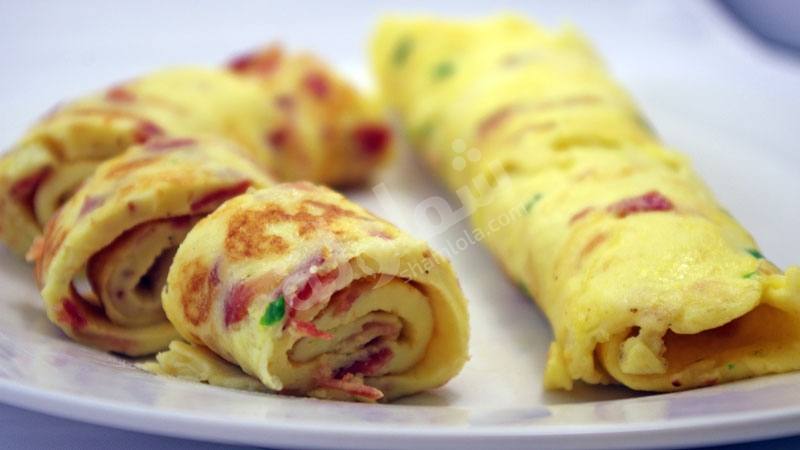- يوضع خليط البيض في المقلاة حتى يبدء في النضج، يلف على شكل رول، حتى ينضج.
