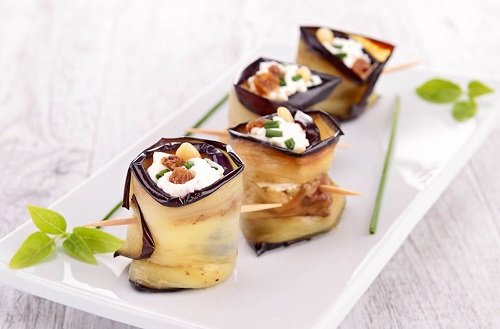 رولات الباذنجان بالجبن سناك، وطبق جانبي رائع، لفائف شهية من الباذنجان المشوي والمحشو بمزيج من جبنة الماعز، الريحان، الزبيب، تثبت اللفائف بأعواد الأسنان الخشبية الصغيرة، وتقدم مباشرة.