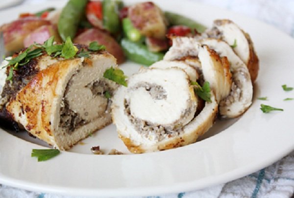 - نضيف ملعقة من حشوة الفطر على شريحة الدجاج ، ثم نقوم بلفها وتثبيتها بأعواد المطبخ
