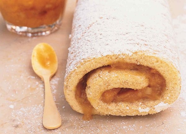 رول الكيك بالمربى ، كيك ساخن من الجوز، مع طبقة من مربى المشمش، يلف على شكل رول ويرش بالسكر الناعم و هو يشبه السويس رول بالكريمة لكن بطريقة ألذ و بنكهة الجوز .