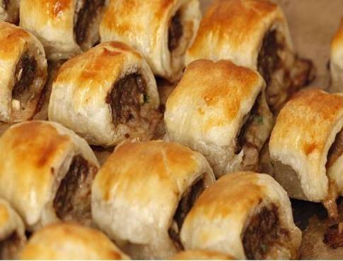 5. افردي العجين طوليا، ثم يوزع اللحم ثم يلف العجين حتي يصبح اسطوانيا .