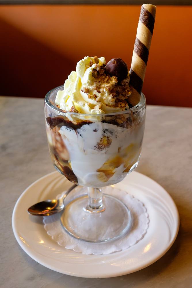 توضع طبقات من الآيس كريم وصلصة الكراميل والموز والفول السوداني في أكواب التقديم و يقدم .