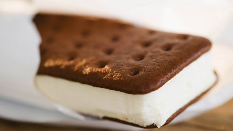 باستخدام سكينة حادة هنقسم الأيس كريم لقطع مستطيلة بنفس حجم قطع البسكوت وهنضيف طبقة من الأيس كريم بين طبقتين من البسكوت لعمل الساندويتش.