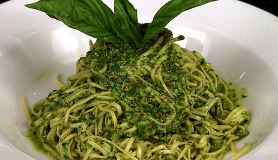 ضعي المعكرونة ” التي يجب ان تكون دافئة ” في طبق التقديم واسكبي عليها من صلصة البيستو.