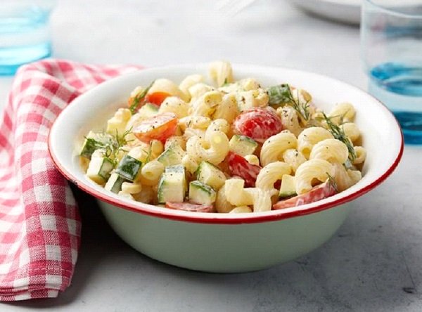 سلطة الباستا بالخضار، هذه الساطة مفيدة للصحة وللريجيم فهي مكونة من الباستا والخضار الصيفية كالطماطم والذرة والكوسا والخيار وهي شهية للغاية .