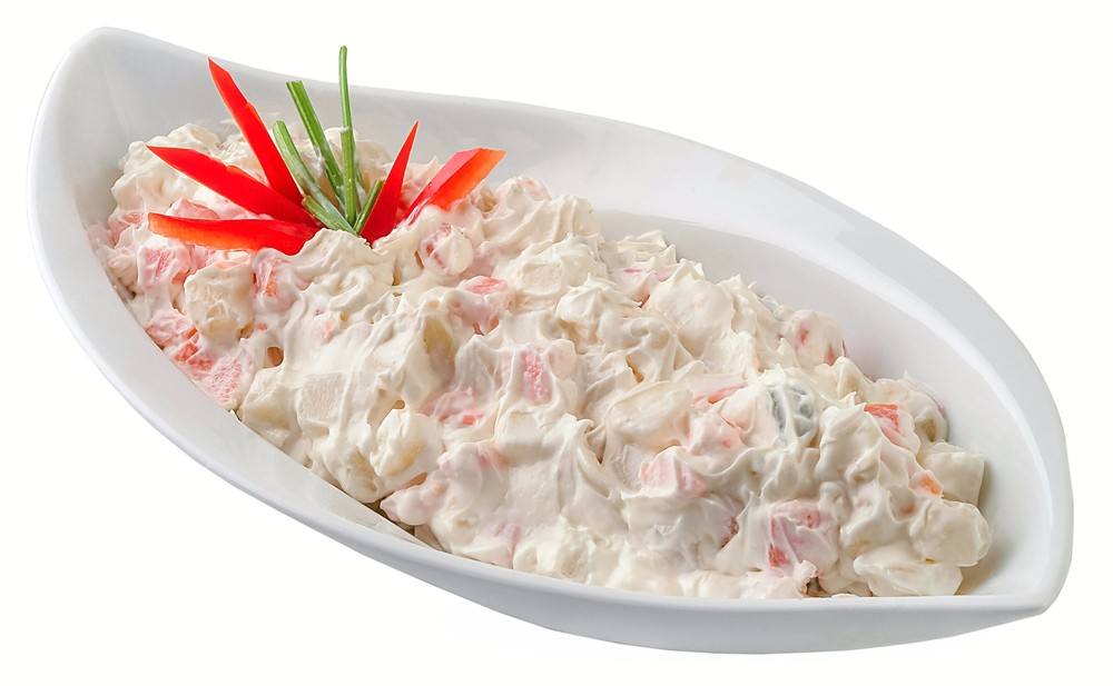 - اضيفي الجبن و الكريمة و المايونيز و الطماطم الى السلطة و قلبي برفق حتى تمام الاختلاط.