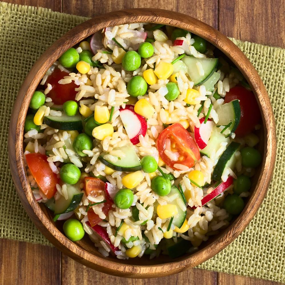 - يضاف الخيار و الفجل و الطماطم و البسلة و الذرة الى الأرز و يقلب برفق.