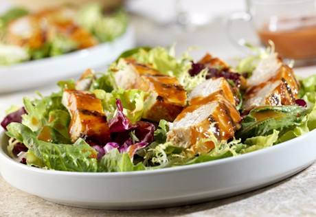 - في طبق لتقديم السلطة ضعي قطع الخس ثم ضعي قطع الدجاج المشوية.