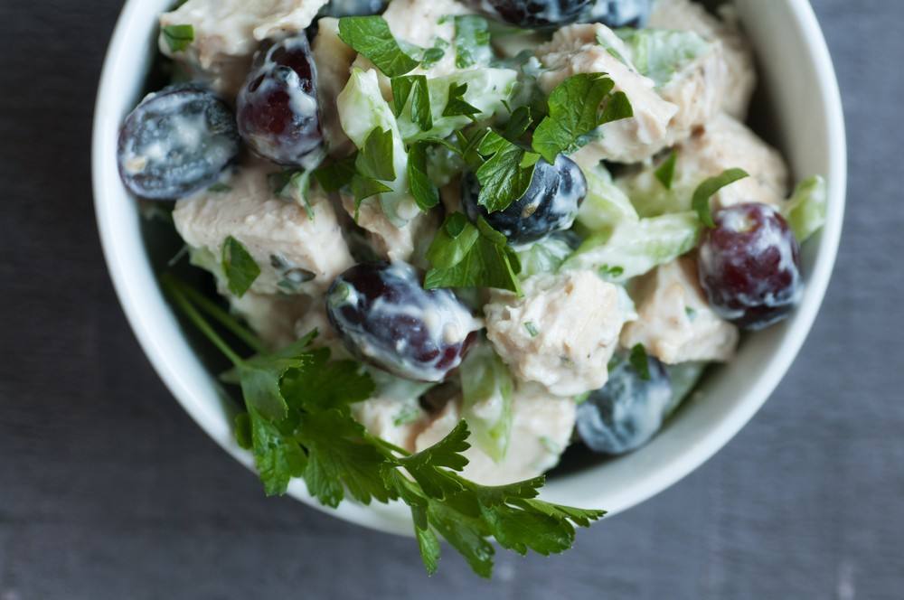 - قدمي سلطة الدجاج بالعنب مع الدجاج الكرسبي الحار.