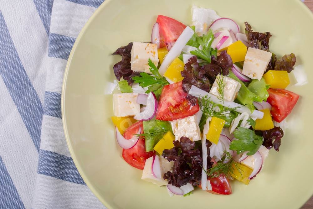 6. توضع السلطة في طبق التقديم، ويوضع فوقها مكعبات الجبنة، ورشة فلفل أحمر، وتقدم.
