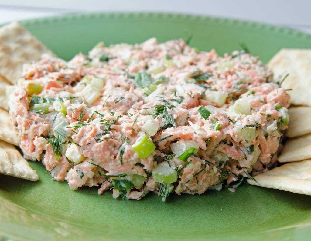 5. يوضع السالمون في وعاء ويضاف إليه البصل الأخضر، والشبت، والكرفس، والمايونيز، والملح، وتخلط جيداً حتى تتجانس.