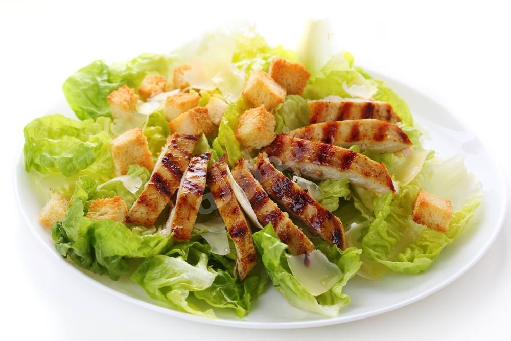 - نحضر طبق التقديم وتوضع فيه السلطة ويرص فوقها صدور الدجاج المشوية والتوست البني المقطع، ثم يرش بعض الجبنة البارميزان عليها وتقدم .