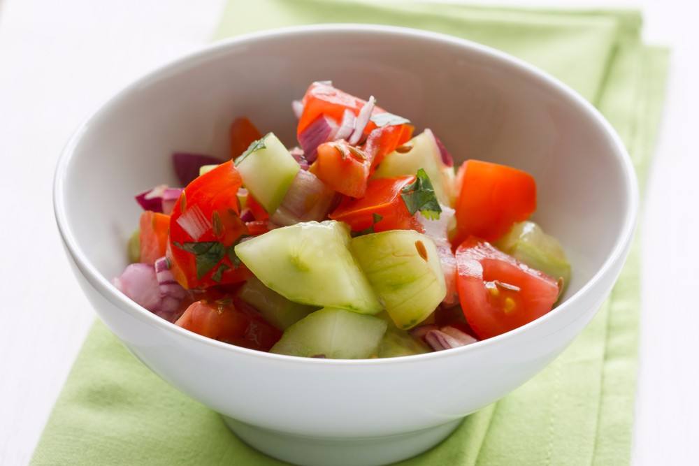 - قومي بتقشير الخيار و قطعيه ثم قومي بتقطيع الطماطم و البصل.